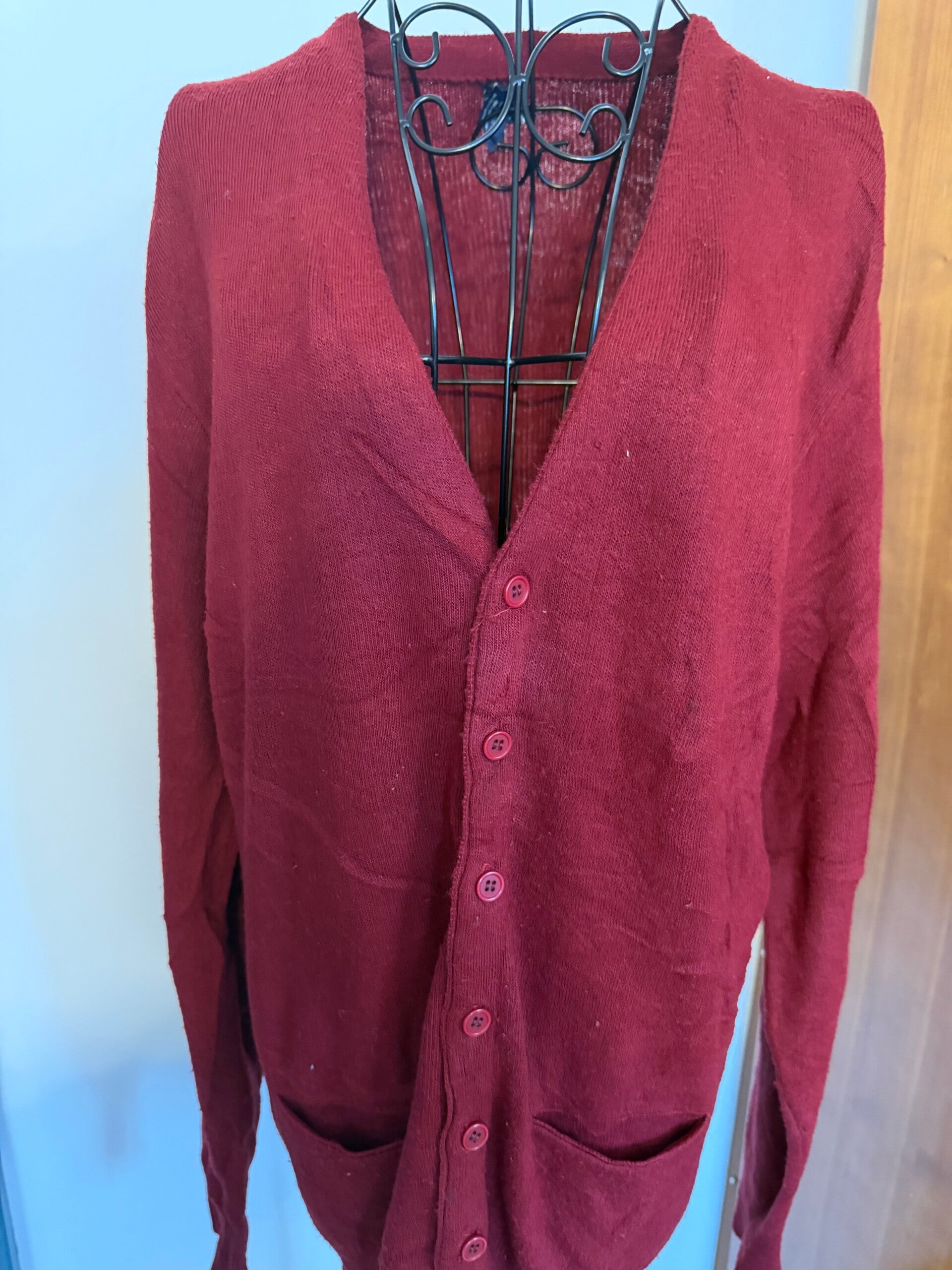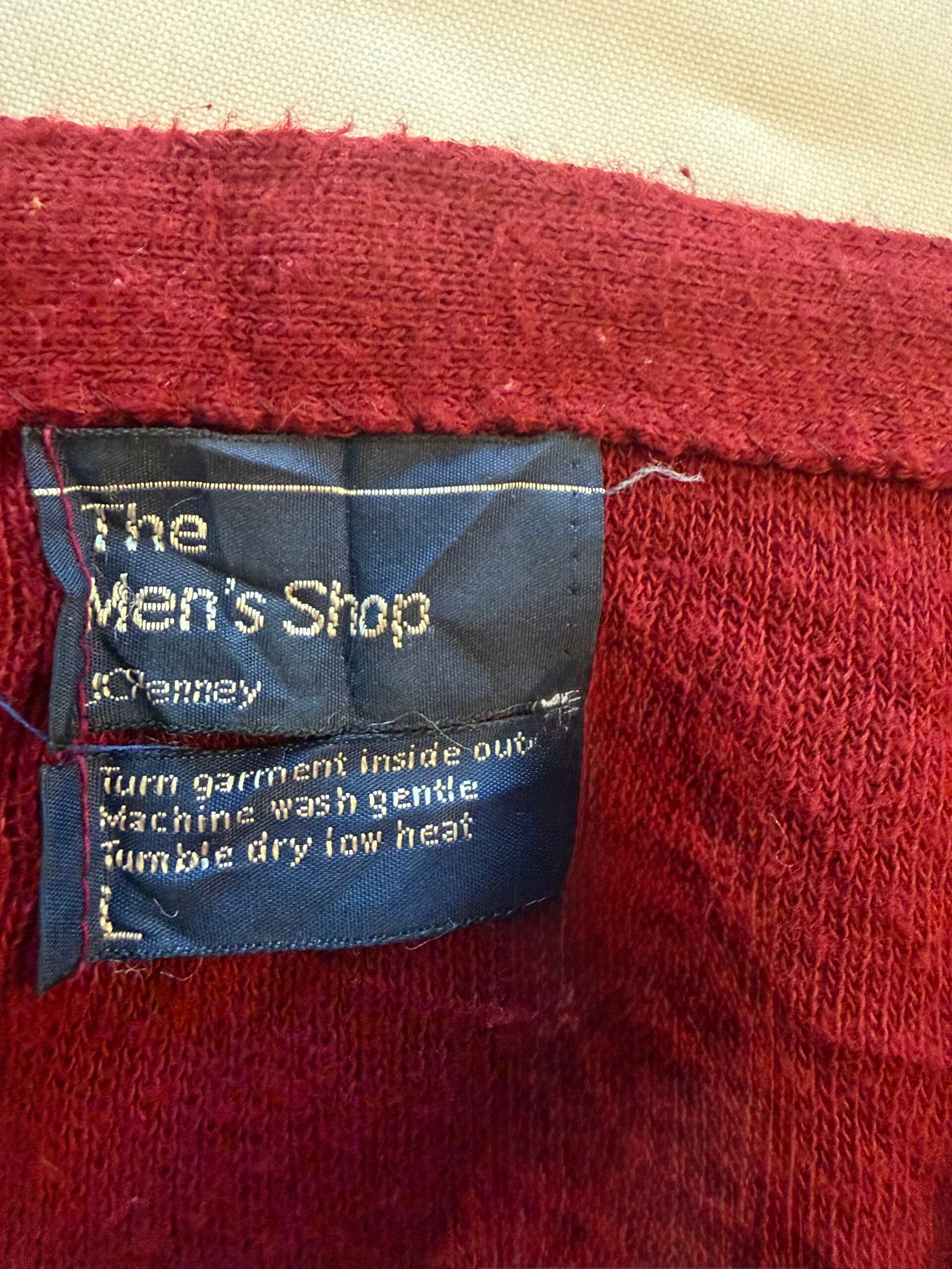 Cardigan Thé Men’s Shop rouge made in USA (rare), taille L acrylique (trou et usure voir photo) Grade BC rare mais abîmé